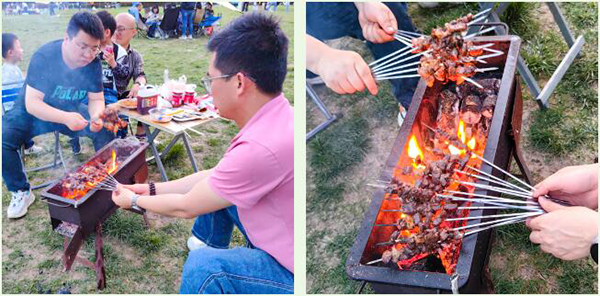 一番活跃运动后,夕阳映照天际。大家开始准备烧烤环节。肉串与烧烤环节配合默契:腌制食材巧搭肥瘦,串于铁签,撒上调料。烧烤师傅独特的撒料技巧与火候把控,让香气四溢的烤肉上桌。这种香气与满足感,市面上难寻。